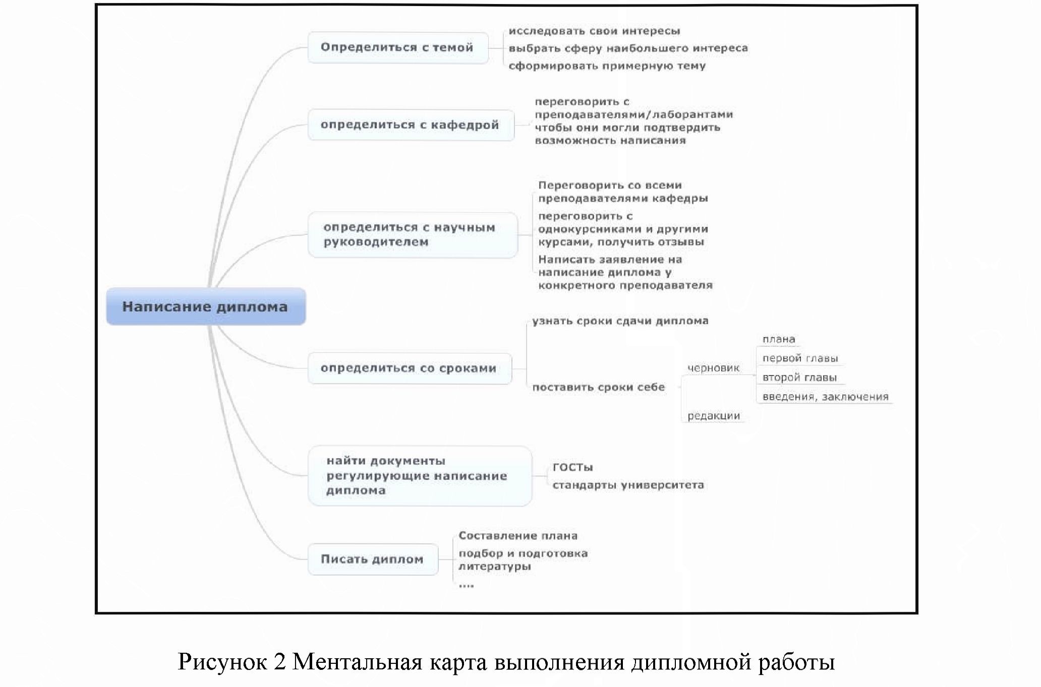 Методы развития креативного мышления можно использовать не только в отдельности, но и в совокупности, где они будут нести более весомый вклад в развитии креативности. Примером можно привести использование ментальной карты при написании плана дипломной работы, или воспользоваться методом гипотез при выполнении экспериментальном части дипломной работы. На Рисунке 2 представлен пример ментальной карты, который отражает план выполнения дипломной работы.