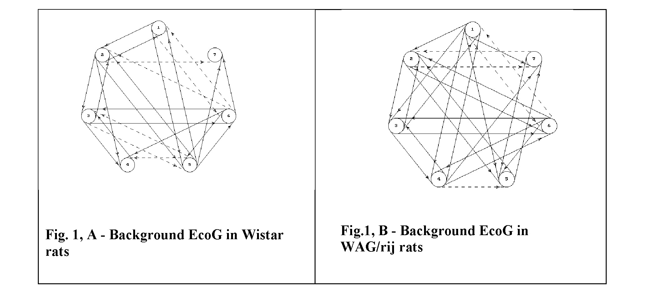 made on the basis of multiple linear regression and correlation. Average amplitude of EcoG signal determined for 10 sec period of registration was used. Altogether 30 such periods were used for final calculation. Finally, oriented functional influences were identified of positive (marked on Figures with solid lines) and negative character (interrupted lines). The direction of influence is marked with arrow. Only those influences were depicted which were statistically significant at P<0,1 [3].
